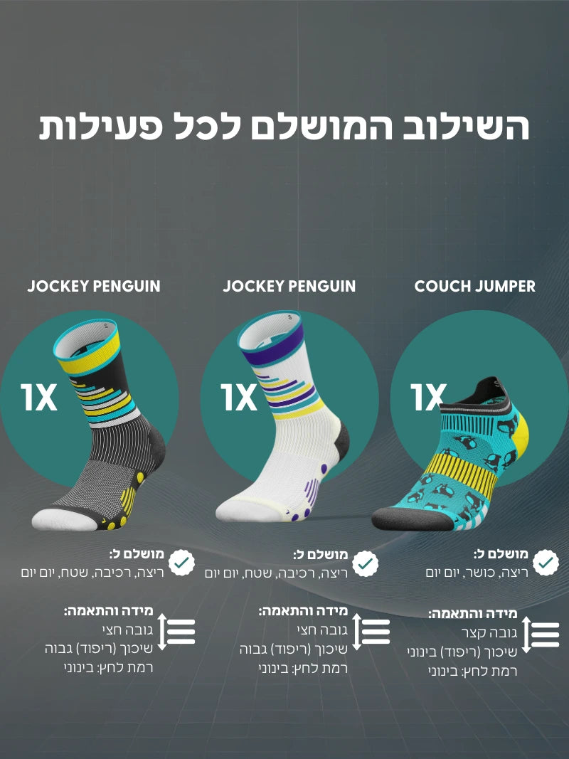אם אתם מחפשים מארז שמשלב עמידות, ביצועים ונוחות לכל יום – זה המארז עבורכם. עם גרבי Jockey לפעילות אינטנסיבית וגרבי Couch לרכות יומיומית, תקבלו חוויית נוחות מקסימלית בכל צעד.