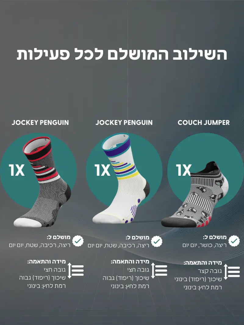 אם אתם מחפשים מארז שמשלב עמידות, ביצועים ונוחות לכל יום – זה המארז עבורכם. עם גרבי Jockey לפעילות אינטנסיבית וגרבי Couch לרכות יומיומית, תקבלו חוויית נוחות מקסימלית בכל צעד.
